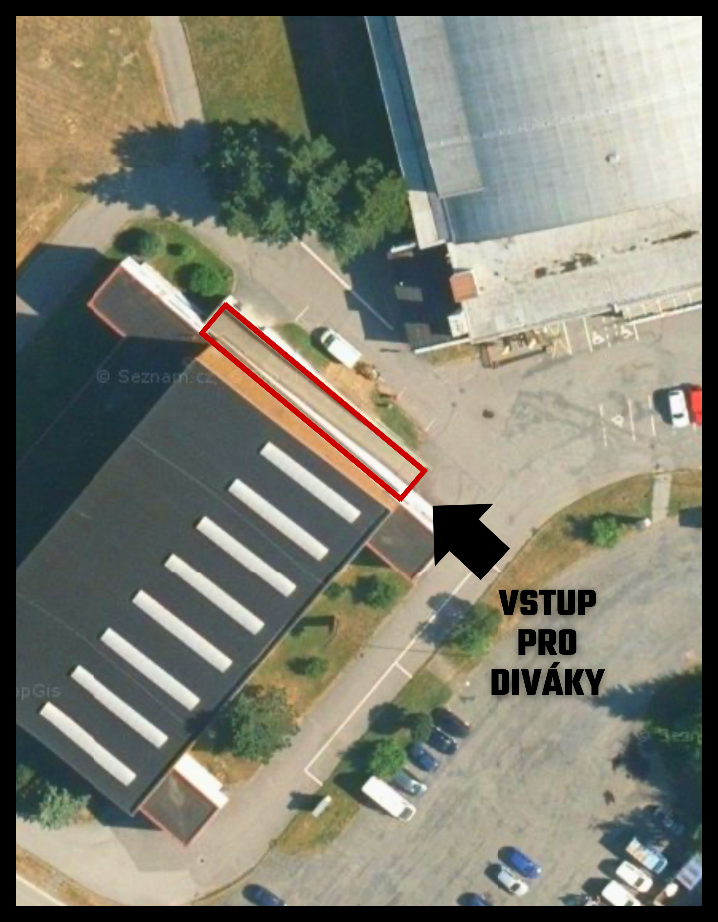Pro diváky je vyhrazen vrchní vstup z pravé strany budovy. ( od zimního stadionu )